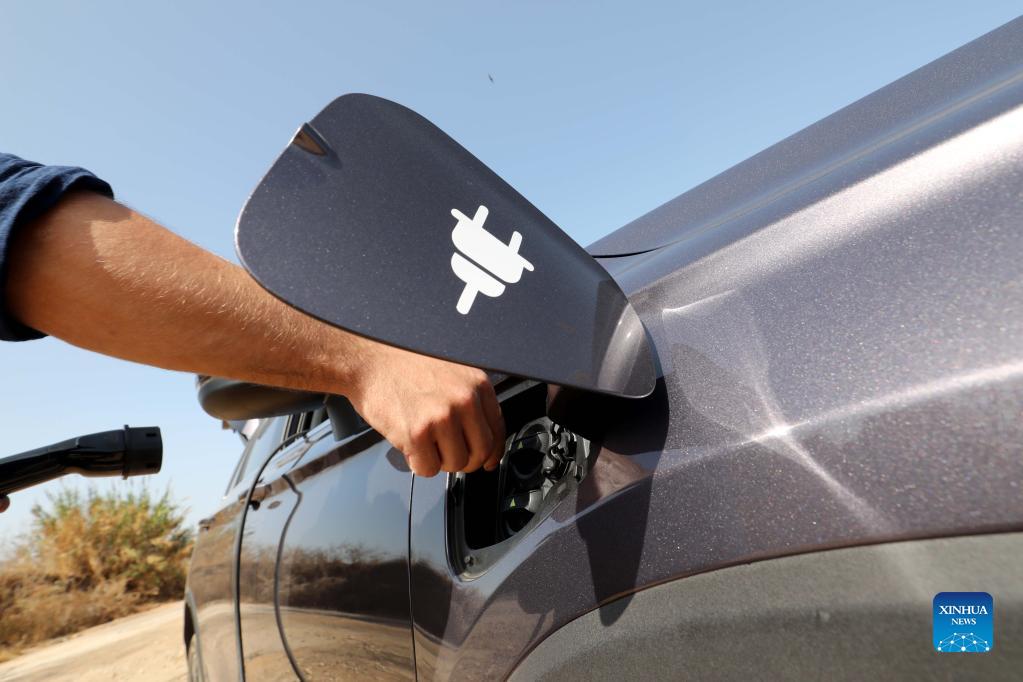 An Israeli car company worker shows an electric car made by Chinese automaker Skyworth Auto in Rishon Lezion, Israel, Oct. 27, 2021. Chinese automaker Skyworth Auto, the electric car division of tech giant Skyworth Group, has begun selling electric cars in Israel through the Israeli dealership Caduri Group, both companies said on Monday. (Photo by Gil Cohen Magen/Xinhua)