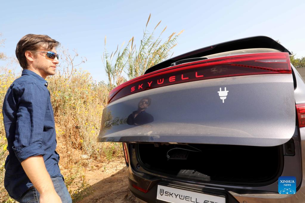 An Israeli car company worker shows an electric car made by Chinese automaker Skyworth Auto in Rishon Lezion, Israel, Oct. 27, 2021. Chinese automaker Skyworth Auto, the electric car division of tech giant Skyworth Group, has begun selling electric cars in Israel through the Israeli dealership Caduri Group, both companies said on Monday. (Photo by Gil Cohen Magen/Xinhua)