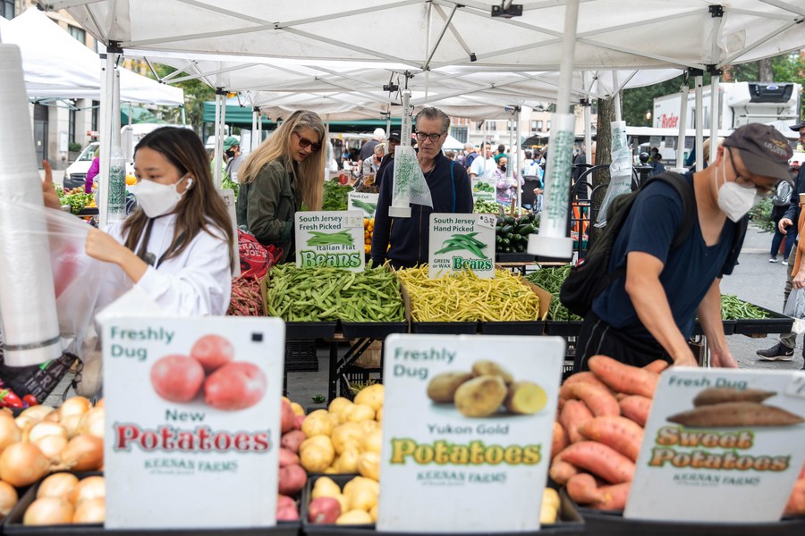 People shop for vegetables at a market in New York, the United States, on Oct. 13, 2021. (Xinhua)