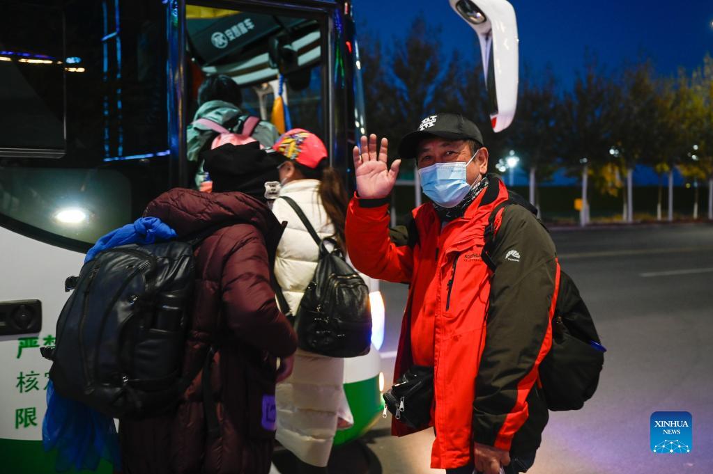 A stranded tourist waves goodbye before he gets on a shuttle bus in Ejina Banner of Alxa League, north China's Inner Mongolia Autonomous Region, Oct. 27, 2021. The 586 stranded tourists leave Ejina Banner in the first batch by a chartered train at 21:52 Wednesday and is expected to arrive in Zhengzhou on Friday. (Xinhua/He Shuchen)