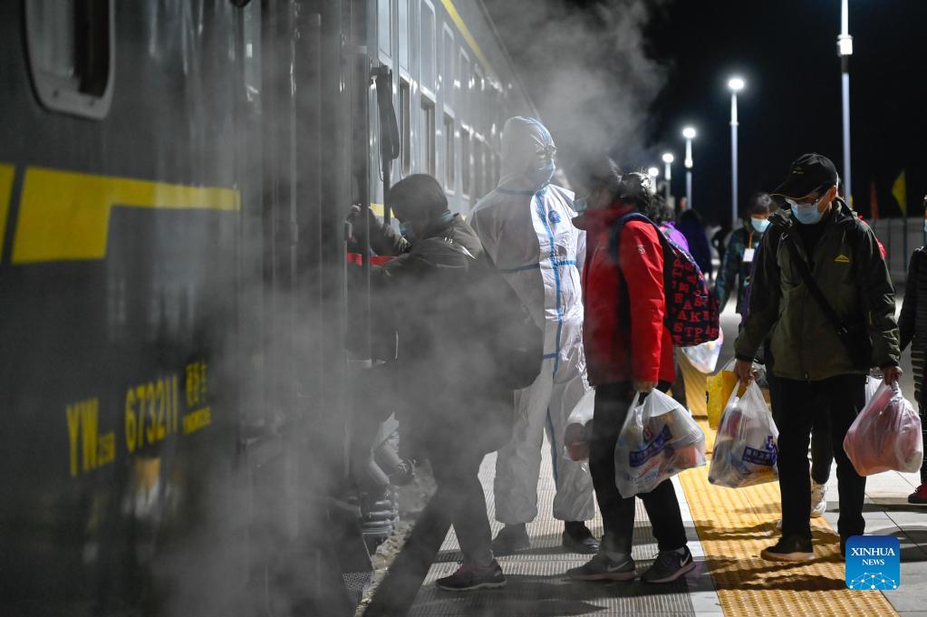 Stranded tourists get on a train at Ejina Railway Station in Ejina Banner of Alxa League, north China's Inner Mongolia Autonomous Region, Oct. 27, 2021. The 586 stranded tourists leave Ejina Banner in the first batch by a chartered train at 21:52 Wednesday and is expected to arrive in Zhengzhou on Friday. (Xinhua/He Shuchen)