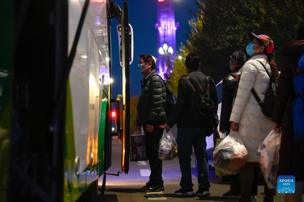 Stranded tourists wait to get on a shuttle bus to Ejina Railway Station in Ejina Banner of Alxa League, north China's Inner Mongolia Autonomous Region, Oct. 27, 2021. The 586 stranded tourists leave Ejina Banner in the first batch by a chartered train at 21:52 Wednesday and is expected to arrive in Zhengzhou on Friday. (Xinhua/He Shuchen)