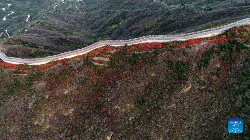 Aerial photo taken on Oct. 27, 2021 shows the autumn scenery in Changqing scenic area in the west of Luquan District of Shijiazhuang, north China's Hebei Province. (Photo by Xu Jianyuan/Xinhua)