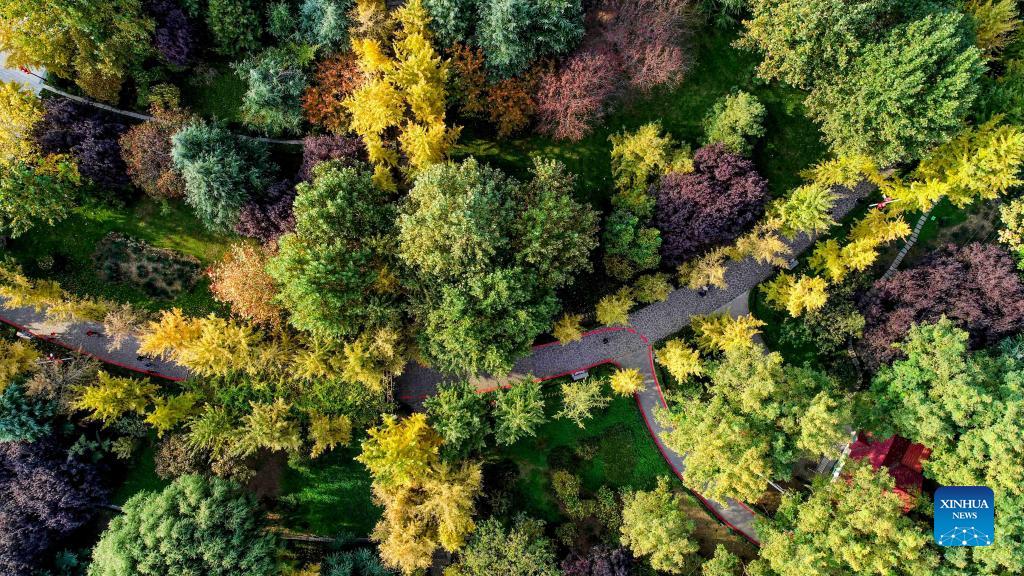 Aerial photo taken on Oct. 27, 2021 shows the autumn scenery in Haishan Park in Luquan District of Shijiazhuang, north China's Hebei Province. (Photo by Xu Jianyuan/Xinhua)