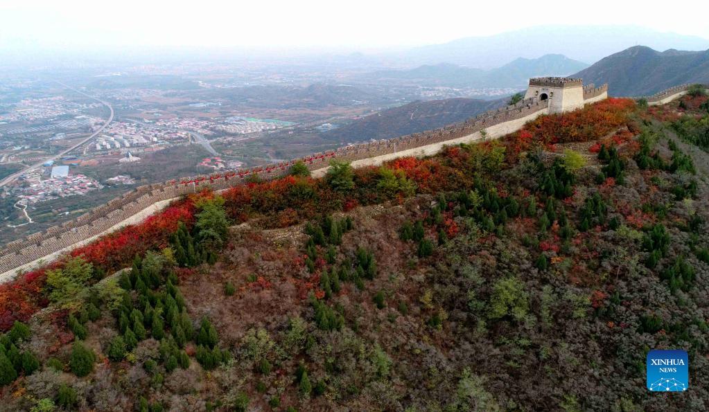 Aerial photo taken on Oct. 27, 2021 shows the autumn scenery in Changqing scenic area in the west of Luquan District of Shijiazhuang, north China's Hebei Province. (Photo by Xu Jianyuan/Xinhua)