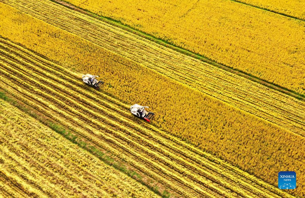 Aerial photo taken on Oct. 28, 2021 shows farmers operating harvesters on a rice field in Jurong City, Jiangsu Province. (Photo by Zhong Xueman/Xinhua)