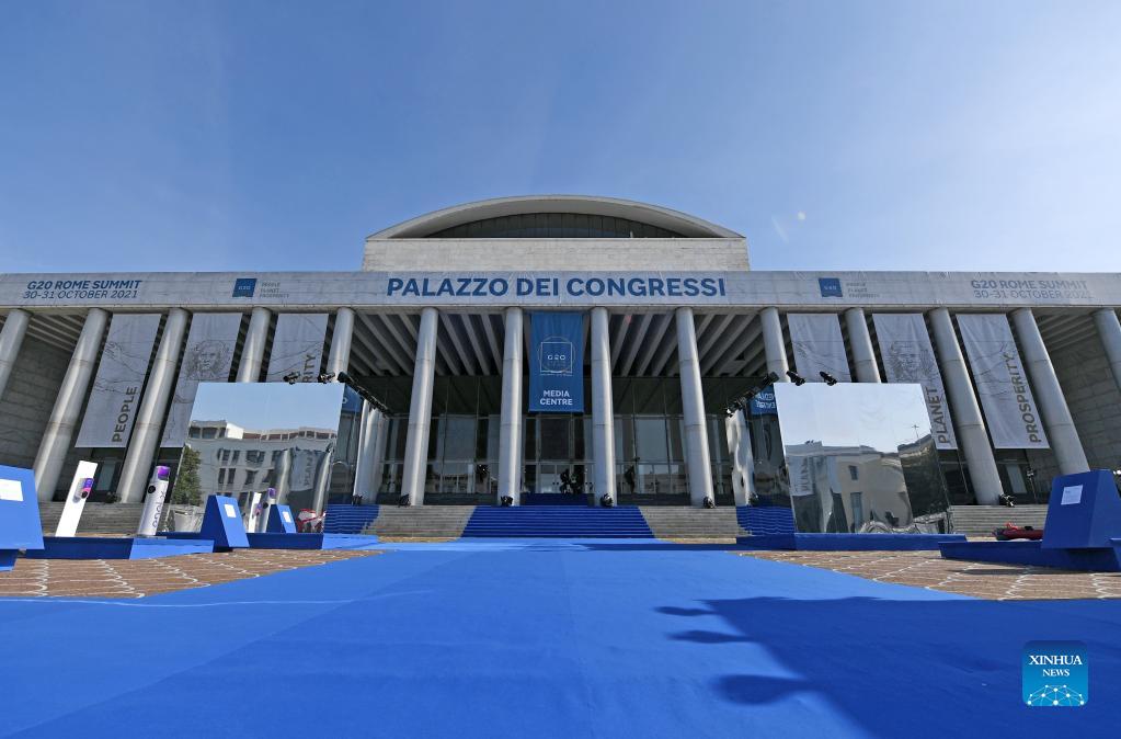 Photo taken on Oct. 28, 2021 shows the media center of the G20 Heads of State and Government Summit in Rome, Italy. The summit of the Group of 20 (G20) leading economies is about to kick off in Italy's capital amid tight security measures and with a packed agenda. (Xinhua/Jin Mamengni)