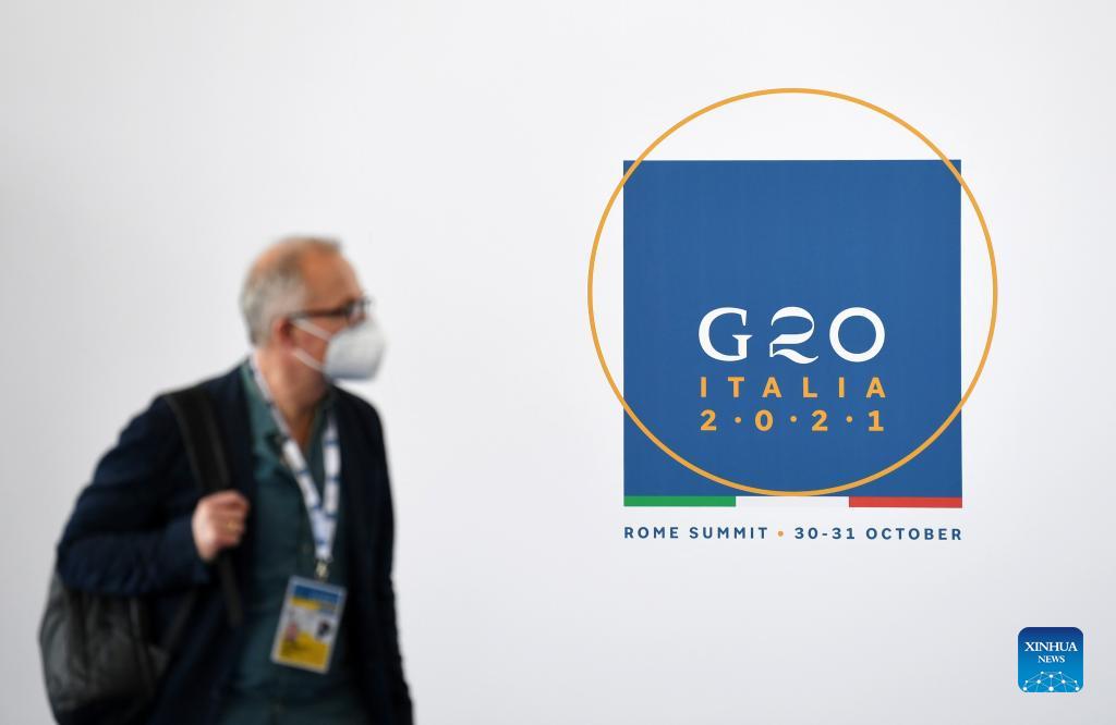A journalist is seen at the media center of the G20 Heads of State and Government Summit in Rome, Italy, on Oct. 28, 2021. The summit of the Group of 20 (G20) leading economies is about to kick off in Italy's capital amid tight security measures and with a packed agenda. (Xinhua/Jin Mamengni)