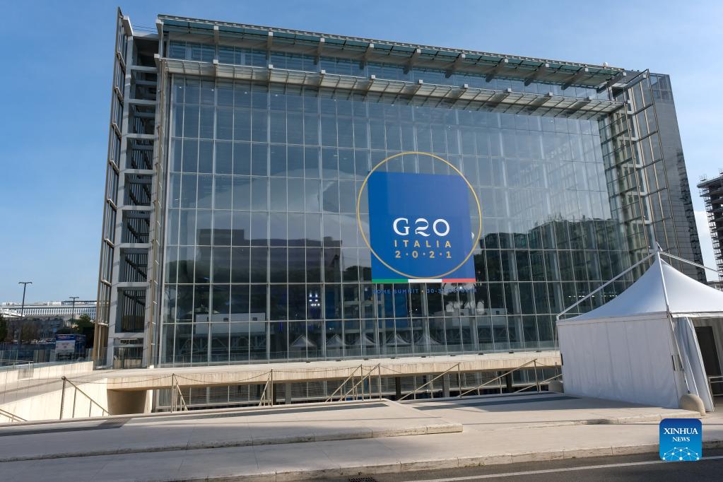 Photo taken on Oct. 28, 2021 shows La Nuvola Convention Center, main venue of the G20 Heads of State and Government Summit, in Rome, Italy. The summit of the Group of 20 (G20) leading economies is about to kick off in Italy's capital amid tight security measures and with a packed agenda. (Xinhua/Zhang Cheng)
