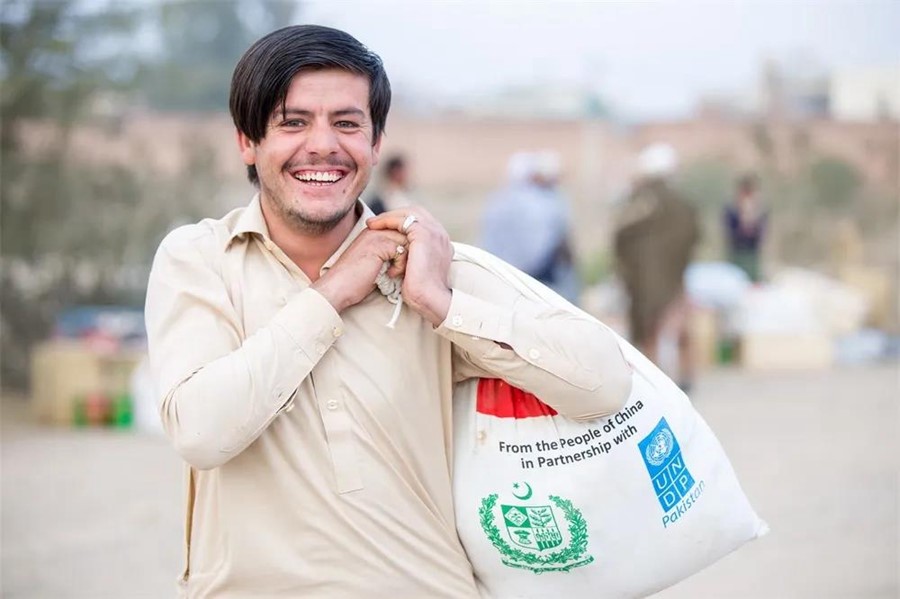 Pakistan's Federally Administered Tribal Areas was hit by floods in 2017. The Chinese government launched post-disaster reconstruction projects there using the South-South Cooperation Assistance Fund to offer emergency humanitarian aid for the local people. Photo shows a man receiving living materials donated through the post-disaster reconstruction projects. (Photo courtesy of the China International Development Cooperation Agency)