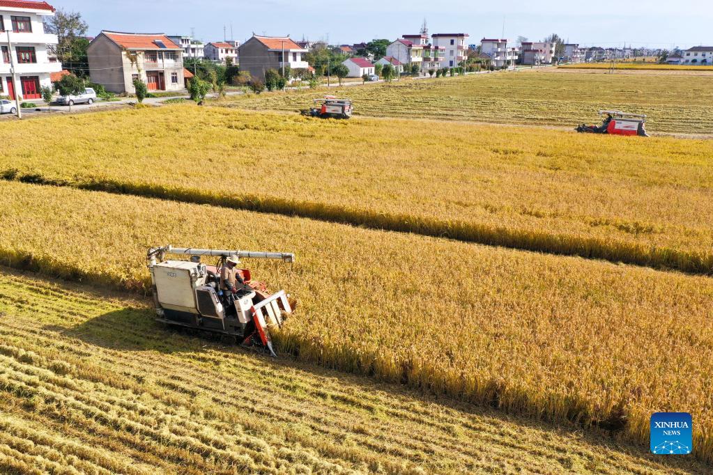 Aerial photo taken on Oct. 28, 2021 shows reapers working in a field in Yujiaba Village of Shizong Township in Tongzhou District, Nantong City of east China's Jiangsu Province. (Xinhua/Li Bo)