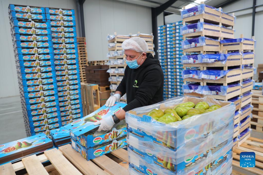 A staff member works at a packing station for Belaian conference pears in Sint-Gillis-Waas, Belgium, Oct. 22, 2021. At the upcoming 4th China International Import Expo (CIIE) to be held this November in Shanghai, Dole and BFV (Belgian Fruit Valley) will introduce a Belgian red conference pear to the Chinese and Asian market for the first time. This conference pear with dark red skin is a variety of the green conference pear which had sold well on the Chinese market for the past decade. (Xinhua/Zheng Huansong)