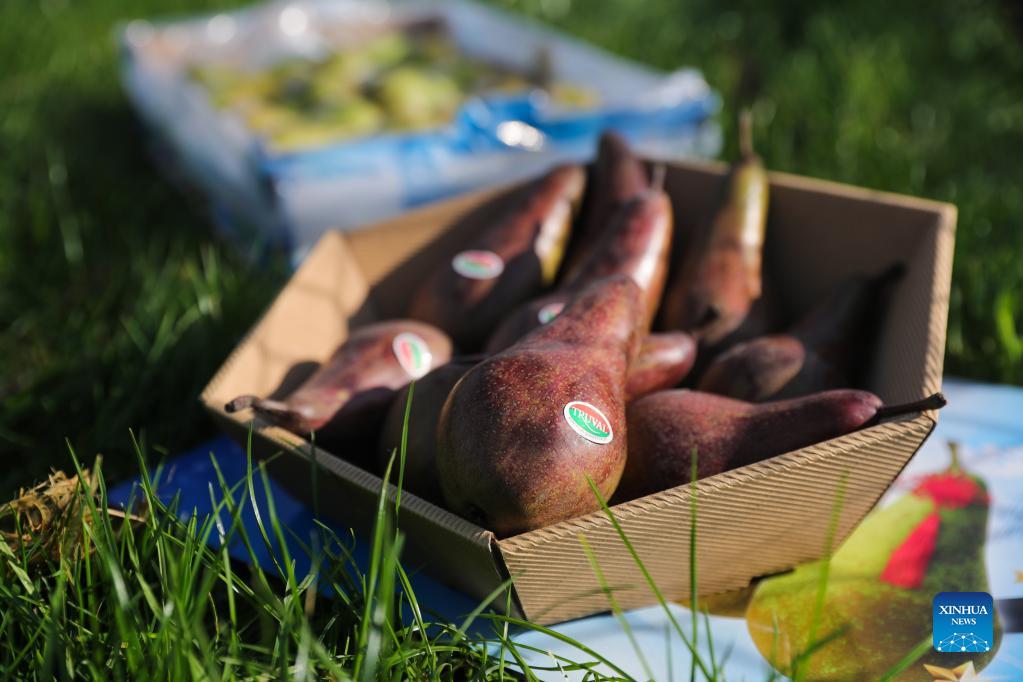 Red conference pears are seen in Sint-Gillis-Waas, Belgium, Oct. 22, 2021. At the upcoming 4th China International Import Expo (CIIE) to be held this November in Shanghai, Dole and BFV (Belgian Fruit Valley) will introduce a Belgian red conference pear to the Chinese and Asian market for the first time. This conference pear with dark red skin is a variety of the green conference pear which had sold well on the Chinese market for the past decade. (Xinhua/Zheng Huansong)