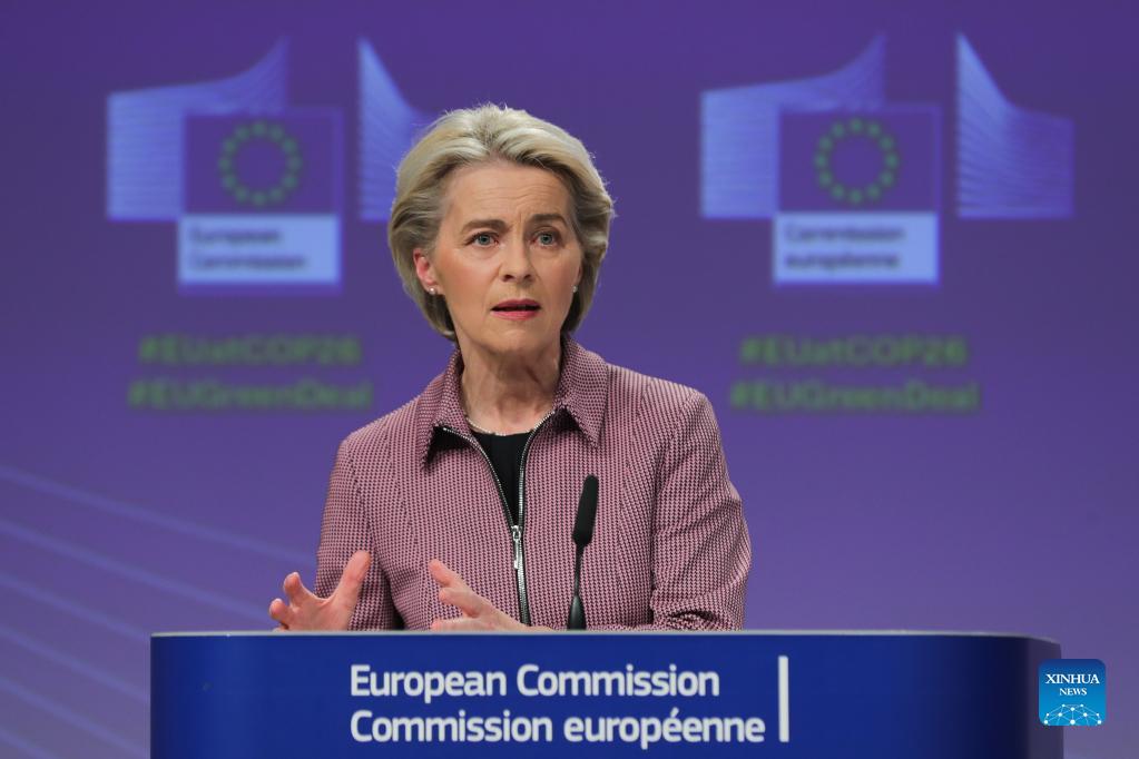 European Commission President Ursula von der Leyen speaks during a press conference ahead of the G20 Summit and the UN Climate Change Conference (COP26) in Brussels, Belgium, Oct. 28, 2021. (Xinhua/Zheng Huansong)