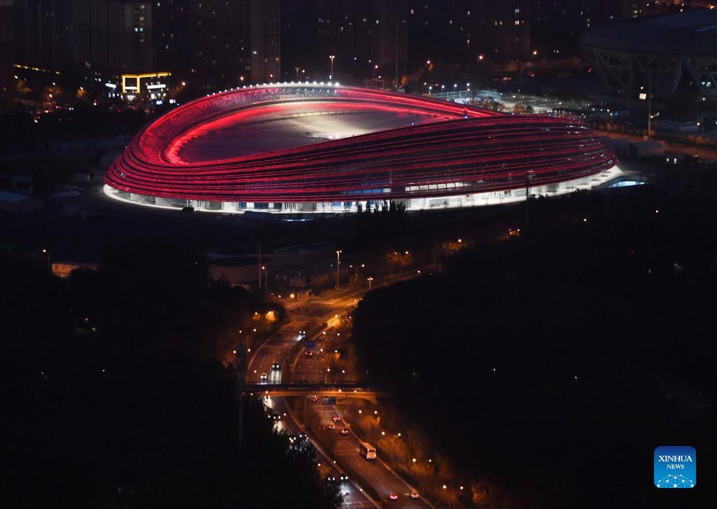 Picture taken with drone on Oct. 28, 2021 shows an aerial view of National Speed Skating Oval. With the renovation of China's National Stadium completed on Oct. 28, 2021, all construction and renovation work of competition venues in Beijing are completed, including infrastructure and supporting facilities. (Xinhua/Zhang Chenlin)