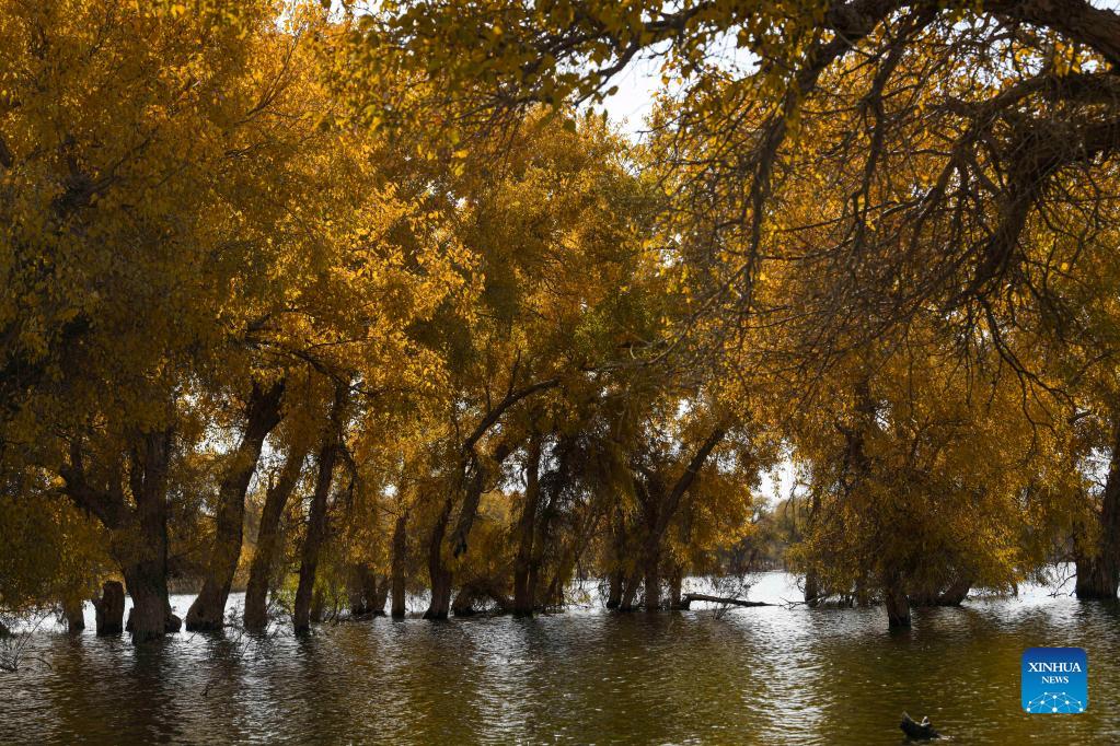 Photo taken on Oct. 27, 2021 shows poplar trees at Lop Nur National Wetland Park in Yuli County, Bayingolin Mongolian Autonomous Prefecture, northwest China's Xinjiang Uygur Autonomous Region. (Xinhua/Zhao Ge)