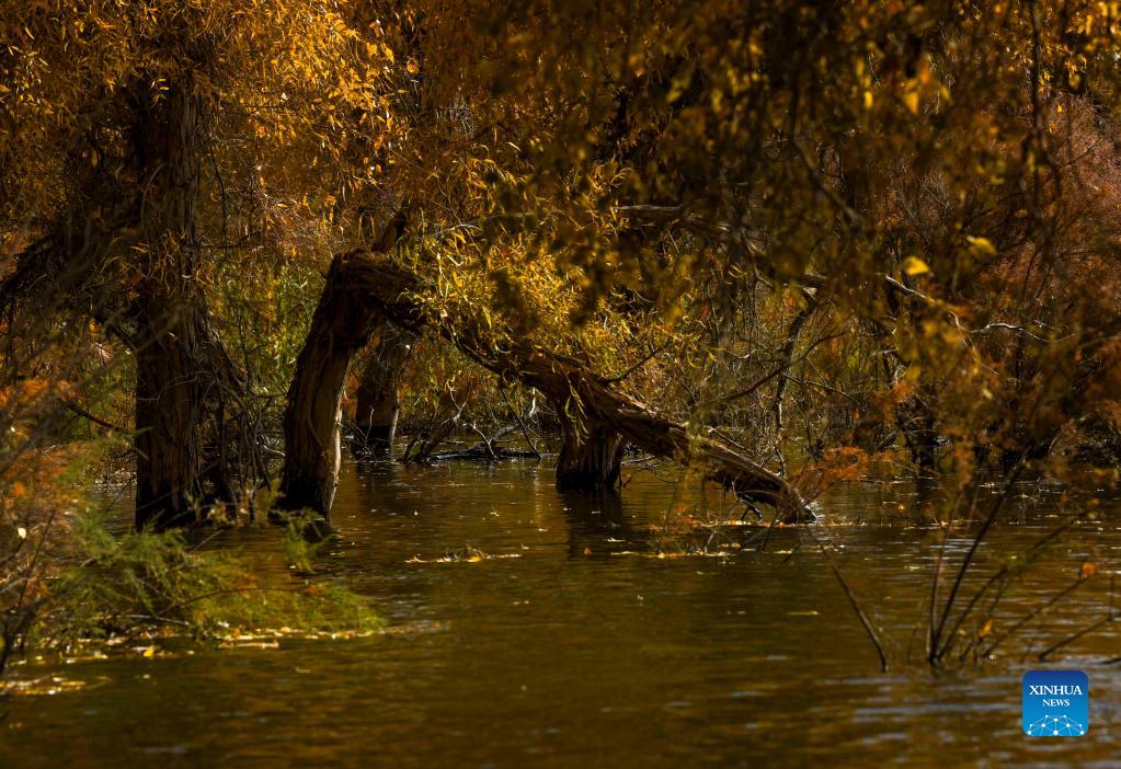 Photo taken on Oct. 27, 2021 shows poplar trees at Lop Nur National Wetland Park in Yuli County, Bayingolin Mongolian Autonomous Prefecture, northwest China's Xinjiang Uygur Autonomous Region. (Xinhua/Zhao Ge)