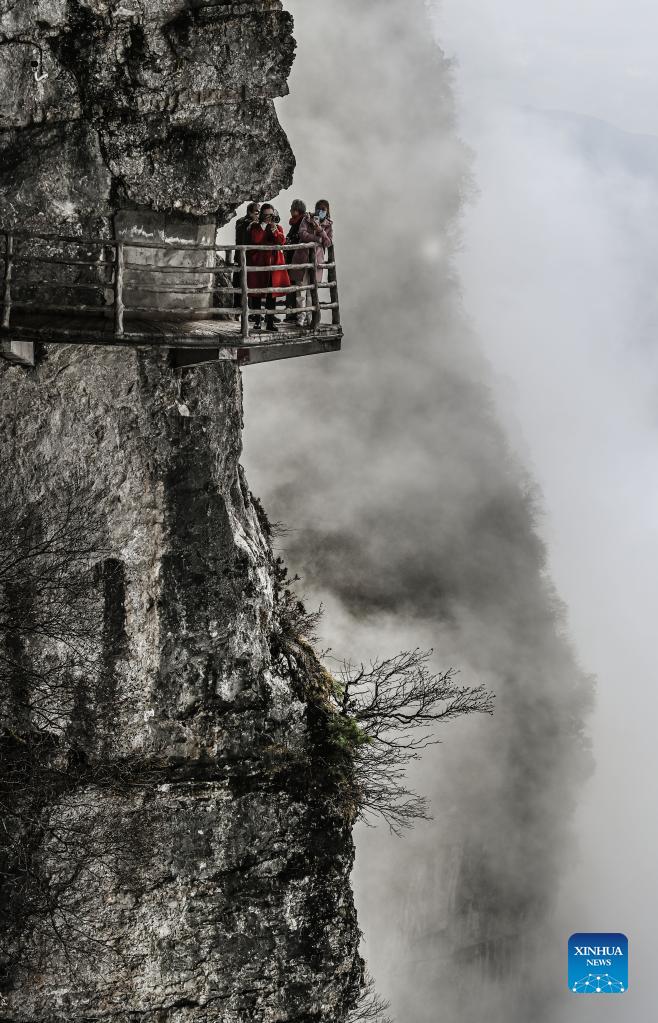 Tourists enjoy the autumn scenery on a plank road in Longtoushan scenic area in Hanzhong, northwest China's Shaanxi Province, Oct. 28, 2021. (Xinhua/Tao Ming)