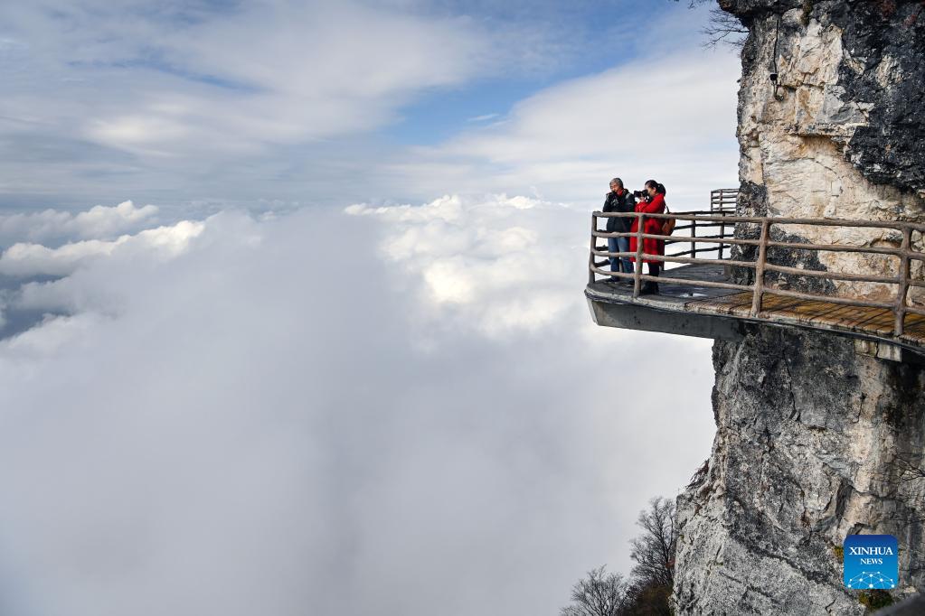 Tourists enjoy the autumn scenery on a plank road in Longtoushan scenic area in Hanzhong, northwest China's Shaanxi Province, Oct. 28, 2021. (Xinhua/Tao Ming)