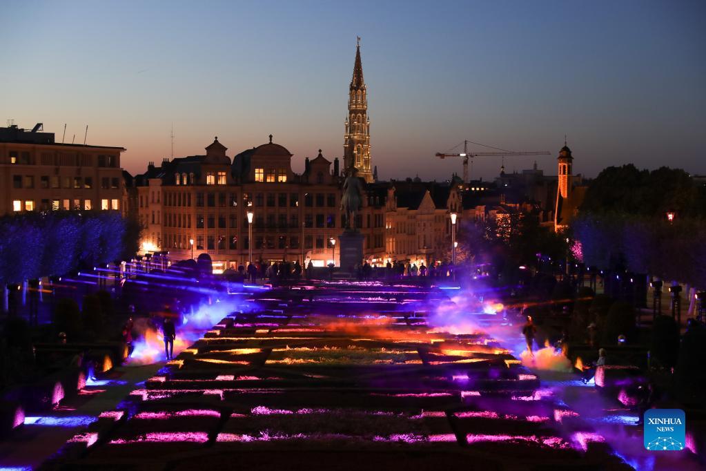 People watch a sound and light show in Brussels, Belgium, on Oct. 28, 2021. The ten-day event Bright Brussels, the festival of lights in Brussels, started on Thursday. (Xinhua/Zheng Huansong)