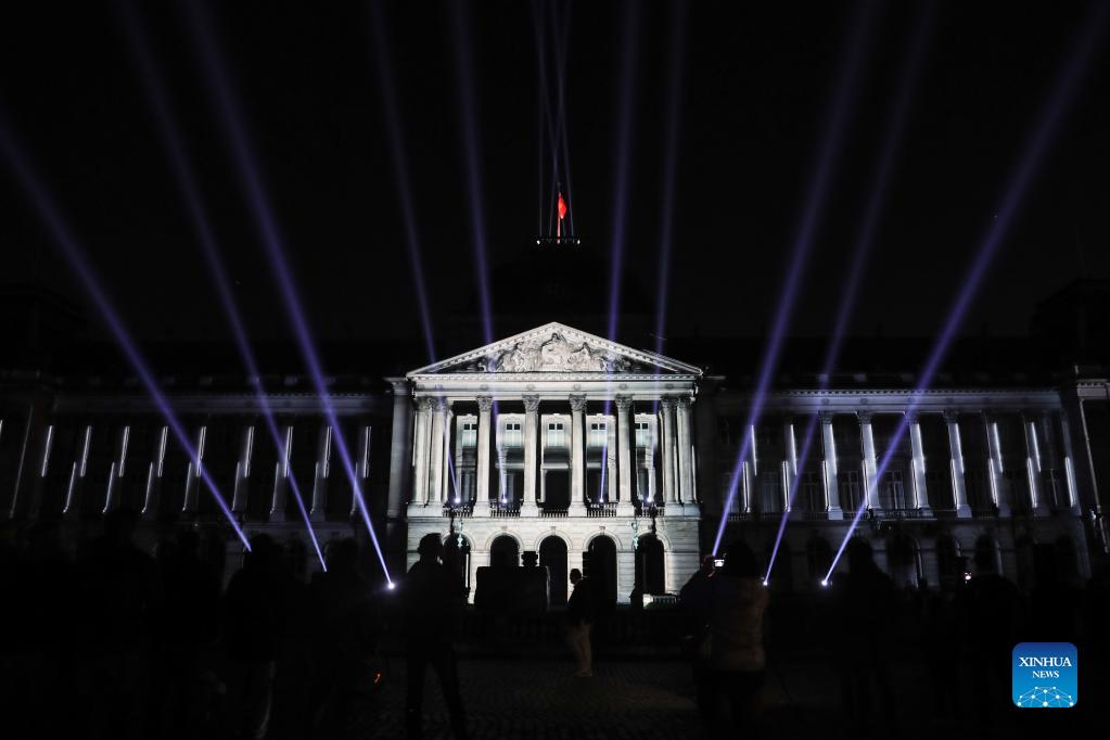 People watch a sound and light show at the Royal Palace in Brussels, Belgium, on Oct. 28, 2021. The ten-day event Bright Brussels, the festival of lights in Brussels, started on Thursday. (Xinhua/Zheng Huansong)