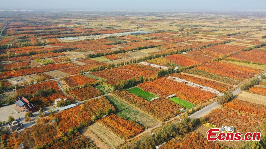 Apricot tree leaves change color during the late autumn in Nanhu Village, Xiazhen Town, Toksun County, Northwest China's Xinjiang Uygur Autonomous Region. (Photo: China News Service/Li Jinghai)