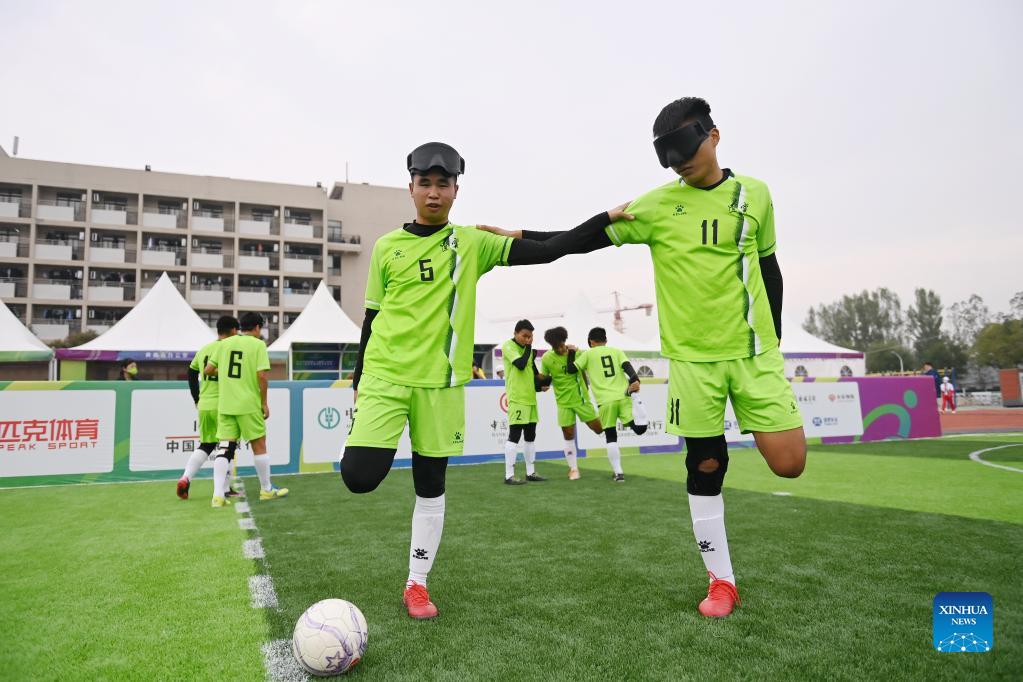 Zhu Ruiming (R) and Tang Zhihua warm up before a match in China's 11th National Games for Persons with Disabilities, in Shaanxi, China, on Oct. 23, 2021. This year, many blind football players who have international match and Paralympic experience competed in China's 11th National Games for Persons with Disabilities and the 8th National Special Olympics in Xi'an, capital of Shaanxi Province, which shows the growth in number of Chinese elite blind football players. (Xinhua/Li Yibo)