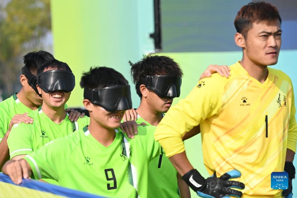 Tang Zhihua (2nd L) reacts before a match in China's 11th National Games for Persons with Disabilities, in Shaanxi, China, on Oct. 24, 2021. This year, many blind football players who have international match and Paralympic experience competed in China's 11th National Games for Persons with Disabilities and the 8th National Special Olympics in Xi'an, capital of Shaanxi Province, which shows the growth in number of Chinese elite blind football players. (Xinhua/Li Yibo)