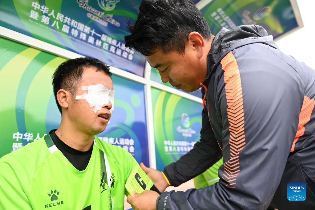Tang Zhihua (L) wears the captain's armband under the help of Zhang Jian before a match in China's 11th National Games for Persons with Disabilities, in Shaanxi, China, on Oct. 23, 2021. This year, many blind football players who have international match and Paralympic experience competed in China's 11th National Games for Persons with Disabilities and the 8th National Special Olympics in Xi'an, capital of Shaanxi Province, which shows the growth in number of Chinese elite blind football players. (Xinhua/Li Yibo)