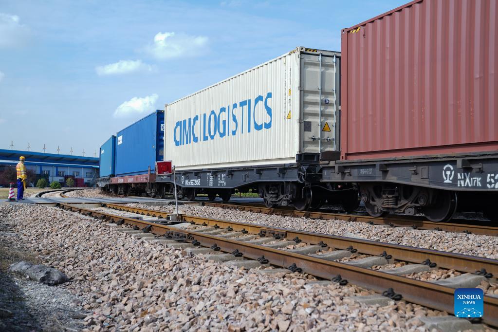 The first "Jinbo" China-Europe freight train is seen upon its arrival in Shanghai, east China, Oct. 29, 2021. On Friday morning, the first "Jinbo" China-Europe freight train arrived in Shanghai, marking the first time for exhibits of the China International Import Expo (CIIE) to be sent by the freight train to the municipality. A total of 35 containers with goods weighing about 460 tonnes were first concentrated from Hamburg and Duisburg in Germany to Malaszewicze in Poland and then were carried by the freight train which entered China via Alataw Pass, a major rail port in Xinjiang, to Shanghai. (Xinhua/Ding Ting)