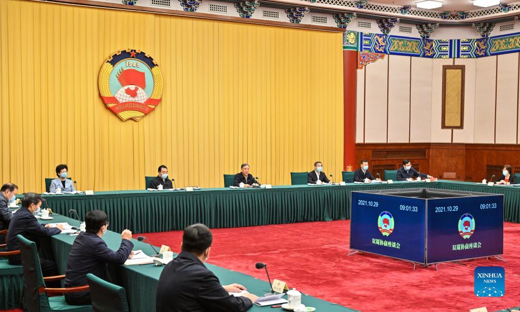 Wang Yang, a member of the Standing Committee of the Political Bureau of the Communist Party of China Central Committee and chairman of the Chinese People's Political Consultative Conference (CPPCC) National Committee, presides over the 55th biweekly consultation session of the 13th CPPCC National Committee, in Beijing, capital of China, Oct. 29, 2021. (Xinhua/Rao Aimin)