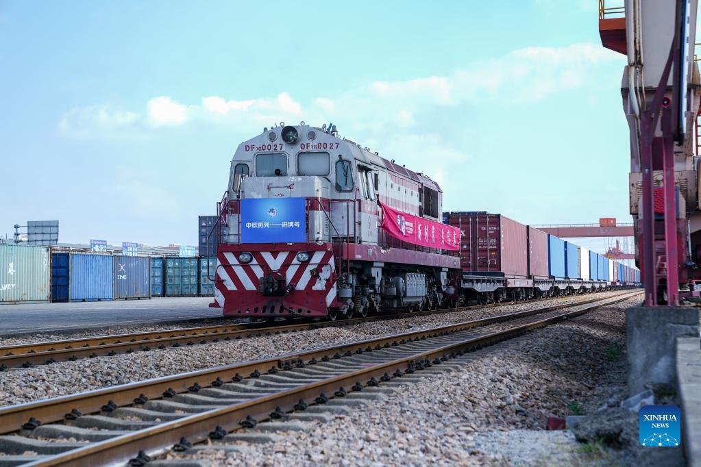 The first "Jinbo" China-Europe freight train is seen upon its arrival in Shanghai, east China, Oct. 29, 2021. On Friday morning, the first "Jinbo" China-Europe freight train arrived in Shanghai, marking the first time for exhibits of the China International Import Expo (CIIE) to be sent by the freight train to the municipality. A total of 35 containers with goods weighing about 460 tonnes were first concentrated from Hamburg and Duisburg in Germany to Malaszewicze in Poland and then were carried by the freight train which entered China via Alataw Pass, a major rail port in Xinjiang, to Shanghai. (Xinhua/Ding Ting)