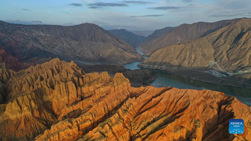 Aerial photo taken on Oct. 27, 2021 shows the Danxia landform scenery in Guide County, northwest China's Qinghai Province. (Xinhua/Wu Gang)