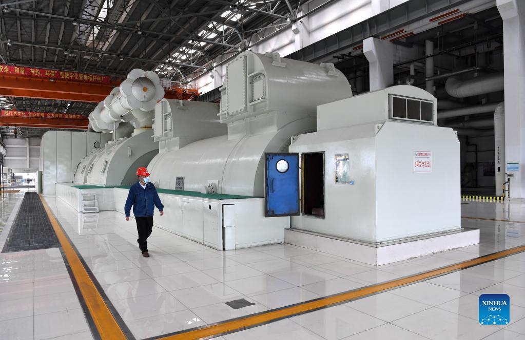 A staff member walks past power generation facilities at Wenergy Hefei Electric Power Co., Ltd. in Hefei, east China's Anhui Province, Oct. 21, 2021. Thermal power still takes up a large share of China's energy output, accounting for about 70 percent of the country's power generation. To mitigate the recent coal supply crunch, regions across China have adopted a raft of measures to stabilize energy supply and expand coal production capacity. (Xinhua/Liu Junxi)