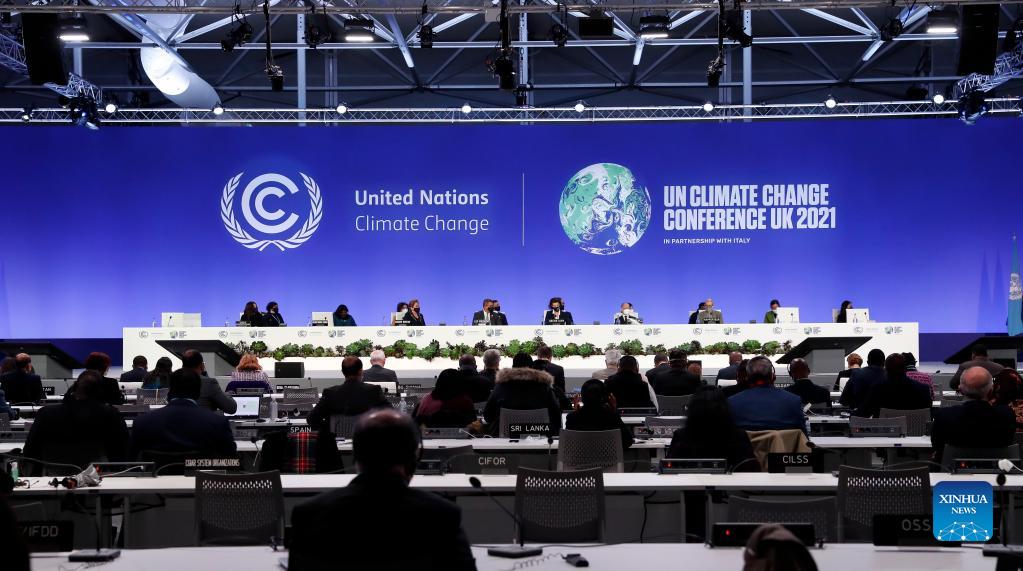 Photo taken on Oct. 31, 2021 shows a general view of the opening ceremony for COP26 in Glasgow, Scotland, the United Kingdom. The 26th United Nations Conference of Parties on Climate Change (COP26), delayed by a year due to the COVID-19 pandemic, kicked off on Sunday in Glasgow, Scotland. As the first conference after the five-year review cycle under the Paris Agreement inked in 2015, delegates are expected to review overall progress and plan future actions on climate change in the coming two weeks. (Xinhua/Han Yan)