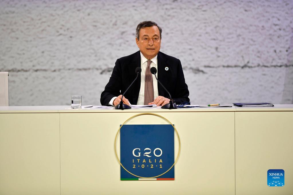 Italian Prime Minister Mario Draghi attends the closing press conference of the G20 Summit in Rome, Italy, on Oct. 31, 2021. The G20 Summit in Rome ended on Sunday with the adoption of a declaration reaffirming the crucial role of multilateralism and international cooperation in overcoming the global challenges arising from the COVID-19 pandemic. (Str/Xinhua)