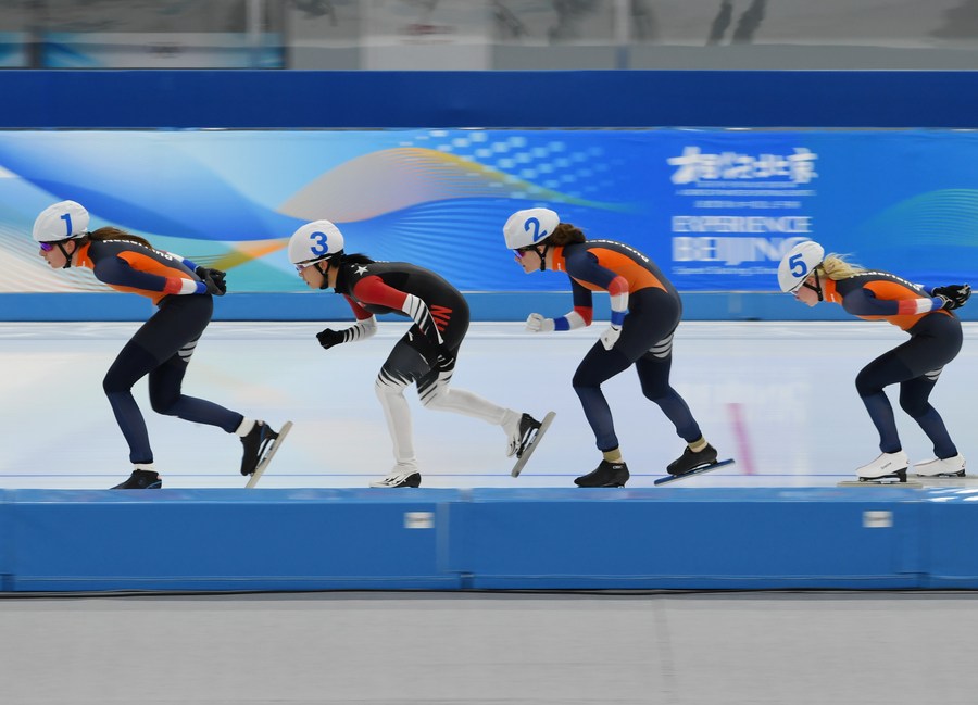 Yang Binyu (2nd L) of China, Sophie Kraaijeveld (1st R), Isabel Grevelt (2nd R), Leonie Bats of the Netherlands compete during the women's mass start competition at the Experience Beijing Speed Skating China Open in Beijing, capital of China, on Oct. 10, 2021. (Xinhua/Zhang Chenlin)