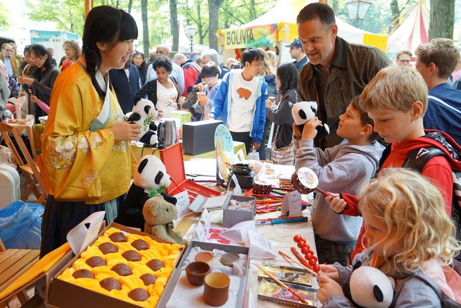 People select souvenirs at the China booth at the Embassy Festival in The Hague, the Netherlands, on Sept. 7, 2019. (Xinhua/Lin Liping)