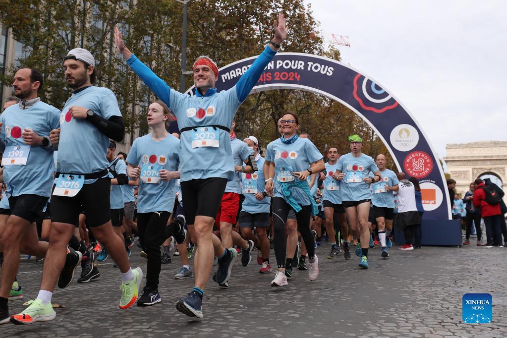 Participants compete during the J-1000 Paris 2024 Marathon Pour Tous or Marathon For All, a 5km run along the Champs-Elysees marking the 1000 days countdown to the opening of Paris 2024 Olympic Games, in Paris, France, Oct. 31, 2021. (Xinhua/Gao Jing)