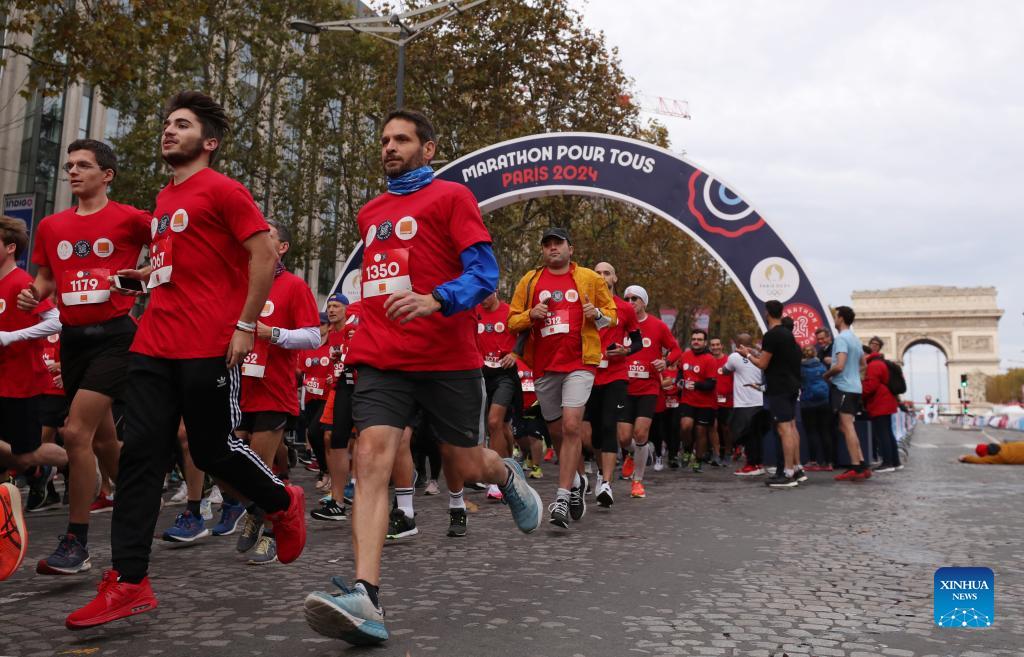 Participants compete during the J-1000 Paris 2024 Marathon Pour Tous or Marathon For All, a 5km run along the Champs-Elysees marking the 1000 days countdown to the opening of Paris 2024 Olympic Games, in Paris, France, Oct. 31, 2021. (Xinhua/Gao Jing)