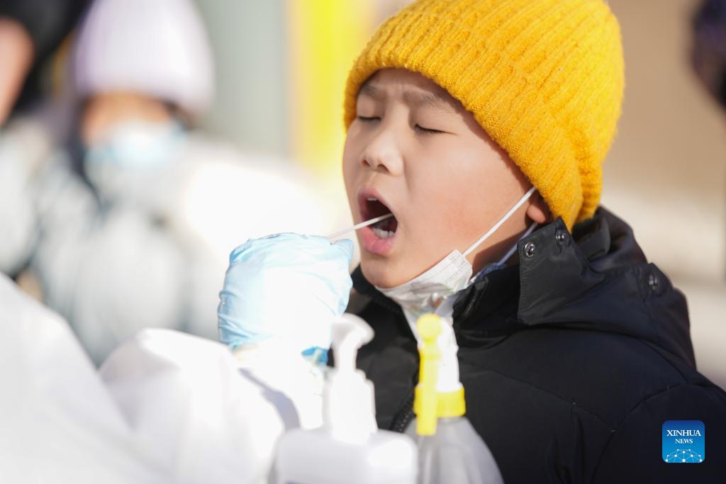 A resident receives nucleic acid test at a testing site in Heihe, northeast China's Heilongjiang Province, Oct. 31, 2021. As of 12:00 p.m. Saturday, Heihe in Northeast China's Heilongjiang Province reported 54 locally transmitted confirmed COVID-19 cases, according to local health authorities. Authorities in Heihe have started massive nucleic acid testing to contain the spread of infections, and taken measures to ensure the supply of daily necessities for residents. (Xinhua/Wang Song)