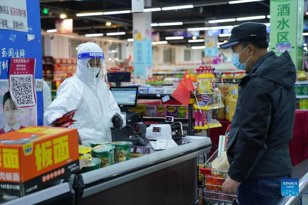 A resident shops at a supermarket in Heihe, northeast China's Heilongjiang Province, Oct. 30, 2021. As of 12:00 p.m. Saturday, Heihe in Northeast China's Heilongjiang Province reported 54 locally transmitted confirmed COVID-19 cases, according to local health authorities. Authorities in Heihe have started massive nucleic acid testing to contain the spread of infections, and taken measures to ensure the supply of daily necessities for residents. (Xinhua/Wang Song)