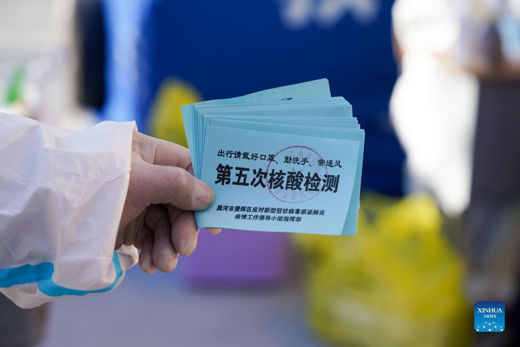 A staff member distributes nucleic acid test records at a testing site in Heihe, northeast China's Heilongjiang Province, Oct. 31, 2021. As of 12:00 p.m. Saturday, Heihe in Northeast China's Heilongjiang Province reported 54 locally transmitted confirmed COVID-19 cases, according to local health authorities. Authorities in Heihe have started massive nucleic acid testing to contain the spread of infections, and taken measures to ensure the supply of daily necessities for residents. (Xinhua/Wang Song)