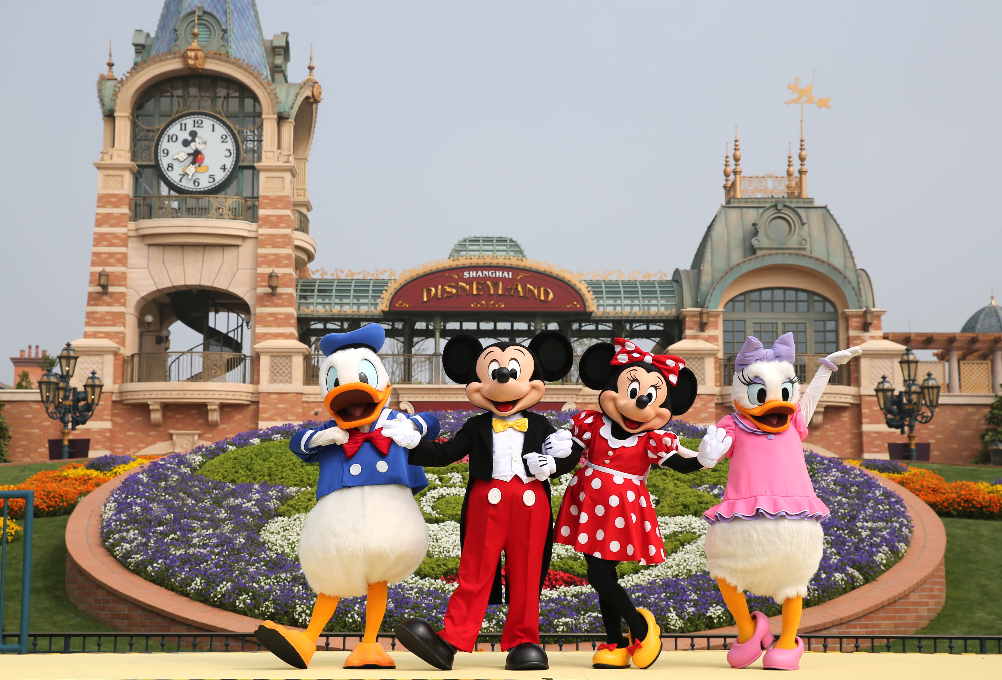 Performers greet tourists at the entrance of the Shanghai Disneyland theme park in east China's Shanghai, May 11, 2020. (Xinhua/Ren Long)