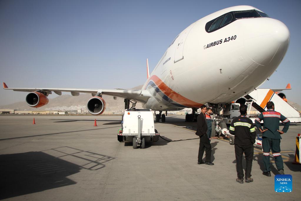 Photo taken on Oct. 31, 2021 shows a cargo plane during a ceremony of resuming the export of pine nuts to China, at Kabul International Airport in Kabul, Afghanistan. Afghanistan on Sunday resumed export of pine nuts to China, a Taliban spokesman confirmed. (Photo by Saifurahman Safi/Xinhua)