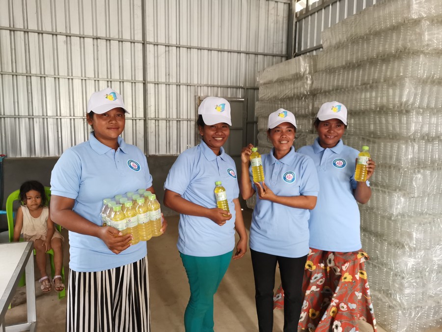 Villagers show detergent products at a factory of a China-aided cooperation project for poverty alleviation in Kandal province of Cambodia, July 31, 2020. (Xinhua)