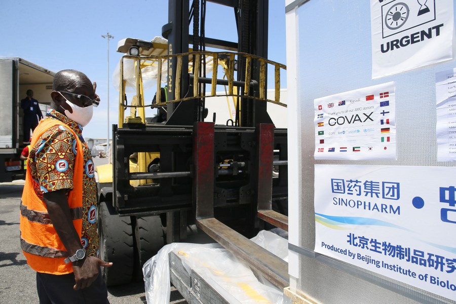 A staff member transfers COVID-19 vaccines provided by China's Sinopharm at an airport in Abidjan, Cote d'lvoire, Sept. 18, 2021. (Photo by Yvan Sonh/Xinhua)