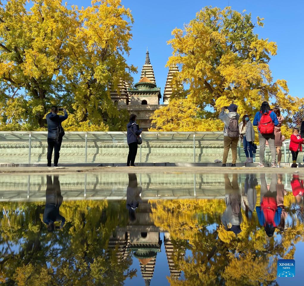 Photo taken with a cellphone on Oct. 31, 2021 shows people visiting Wuta (five-pagoda) Temple in Beijing, capital of China. (Xinhua/Wang Qingqin)