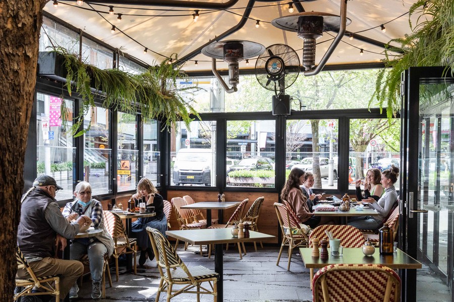 People dine at a restaurant after the business is resumed in Canberra, Australia, Oct. 15, 2021. (Photo by Chu Chen/Xinhua)