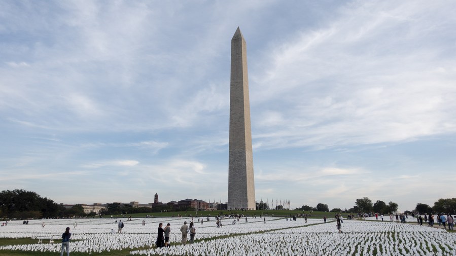 White flags honoring the lives lost to COVID-19 are seen on the National Mall in Washington, D.C., the United States, on Oct. 2, 2021. (Xinhua/Liu Jie)